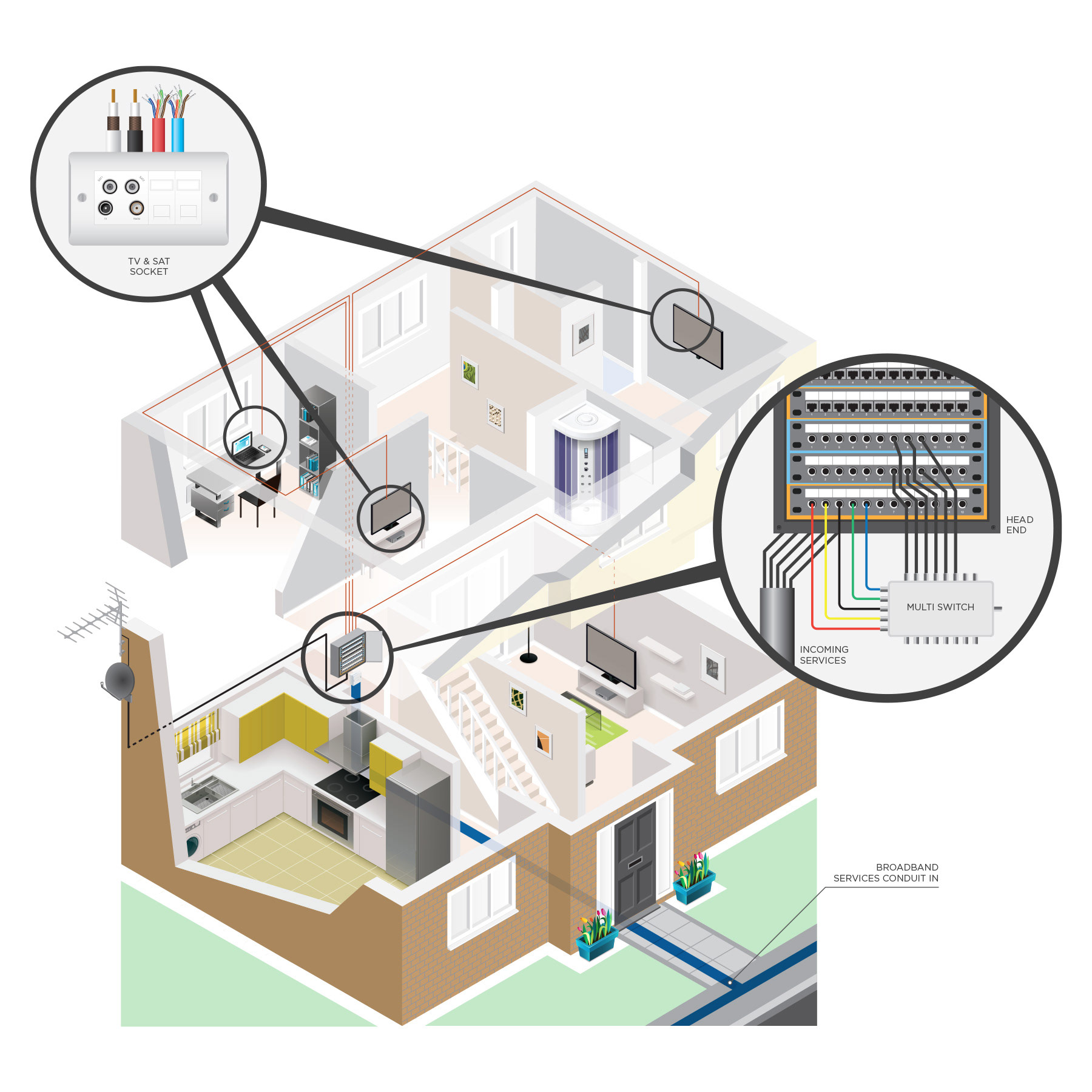 CEDIA required a set of house schematic illustrations to show best wiring practices in the home. These highly complex drawings include cut-aways and fly out detailing as well as a set of individual products.