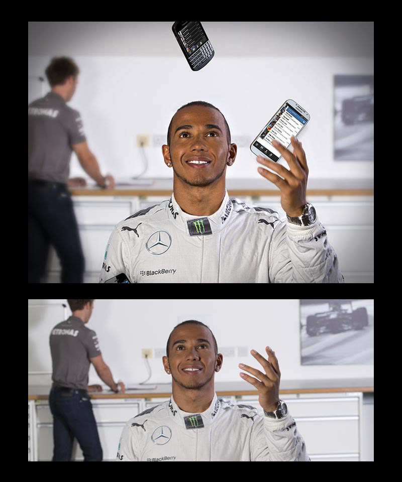 A composition of supplied images to show Lewis Hamilton juggling Blackberry devices for promotional purposes.