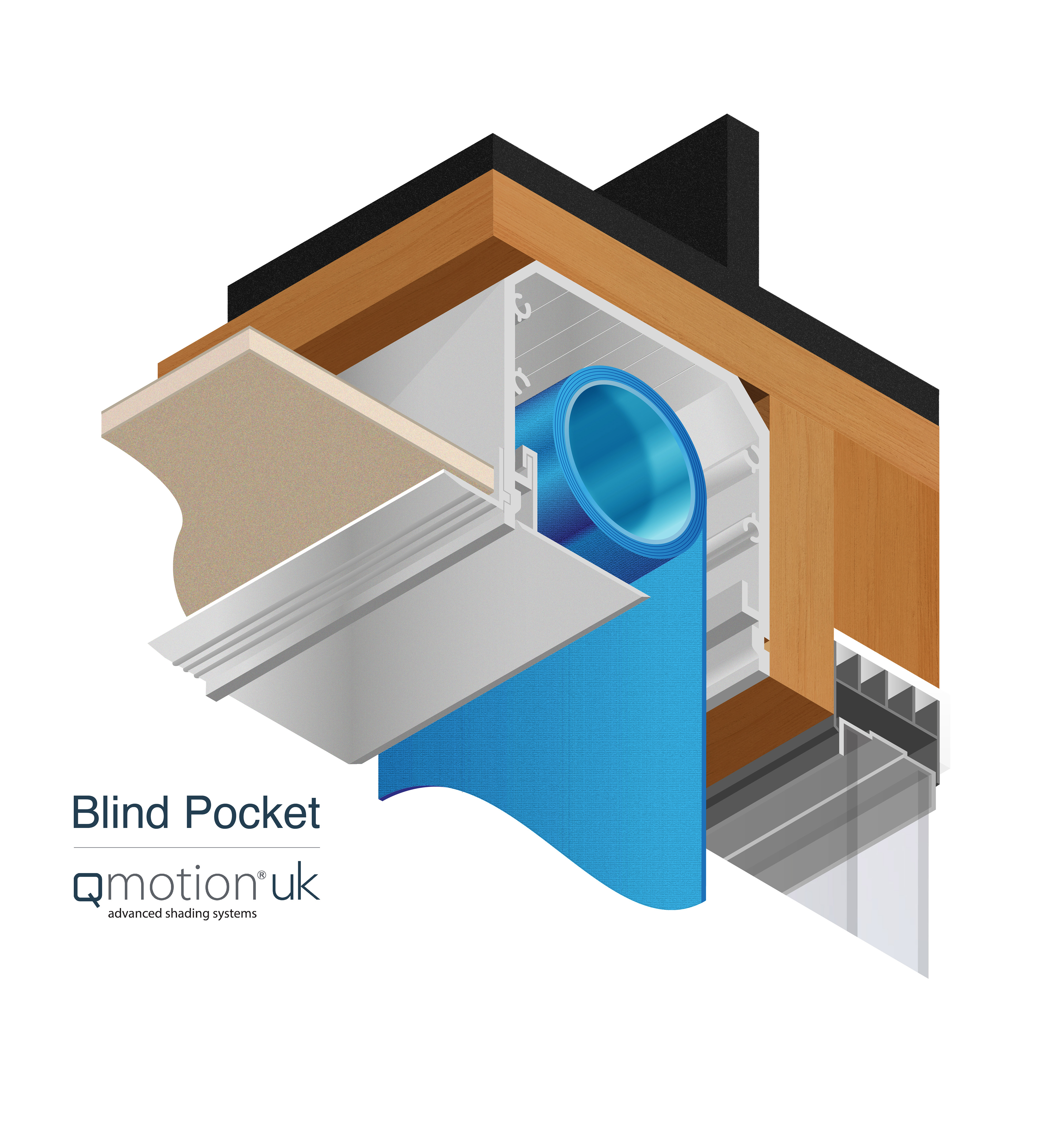 Motorised window treatment company QMotion UK has introduced Blind Pocket, a blind concealment product. From a sample of the extruded product, HK Designs created this isometric illustration of the product a cutaway section of its proposed environment.